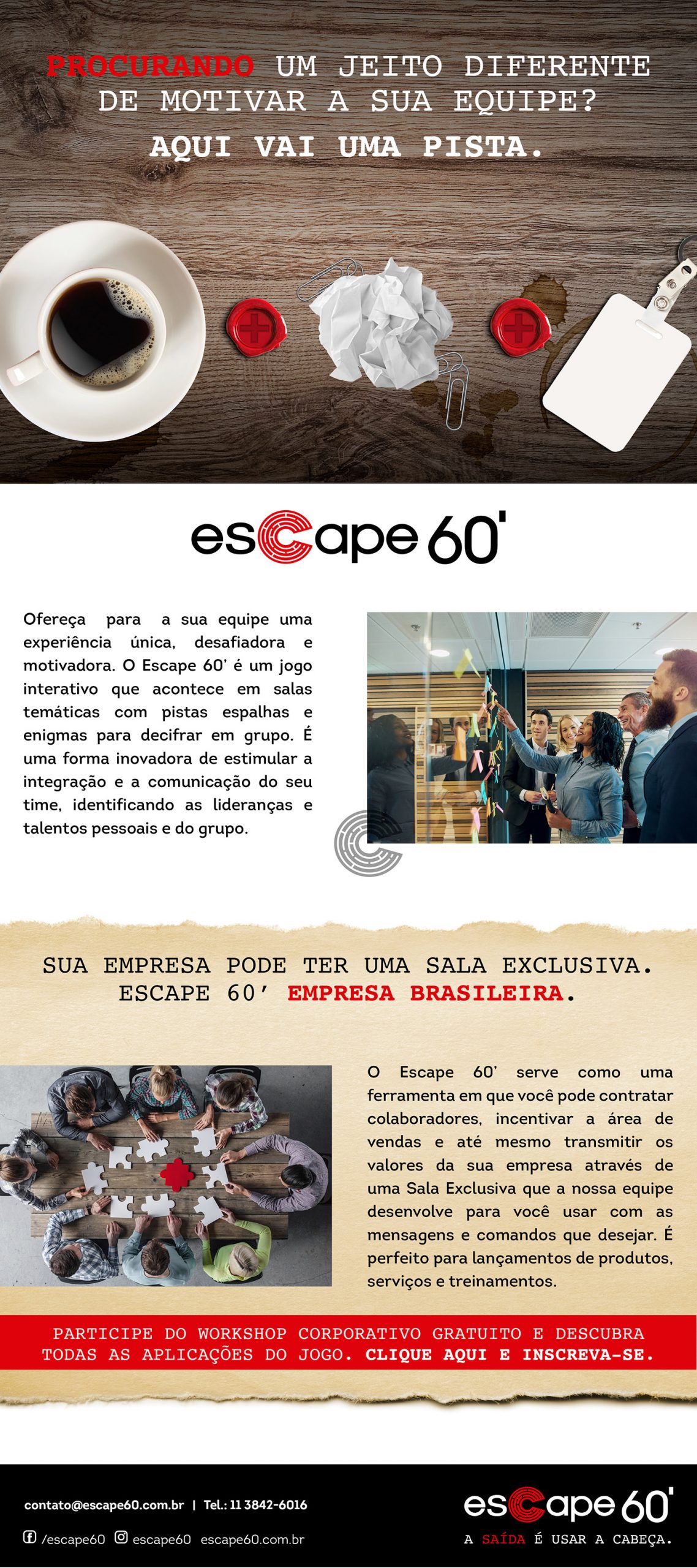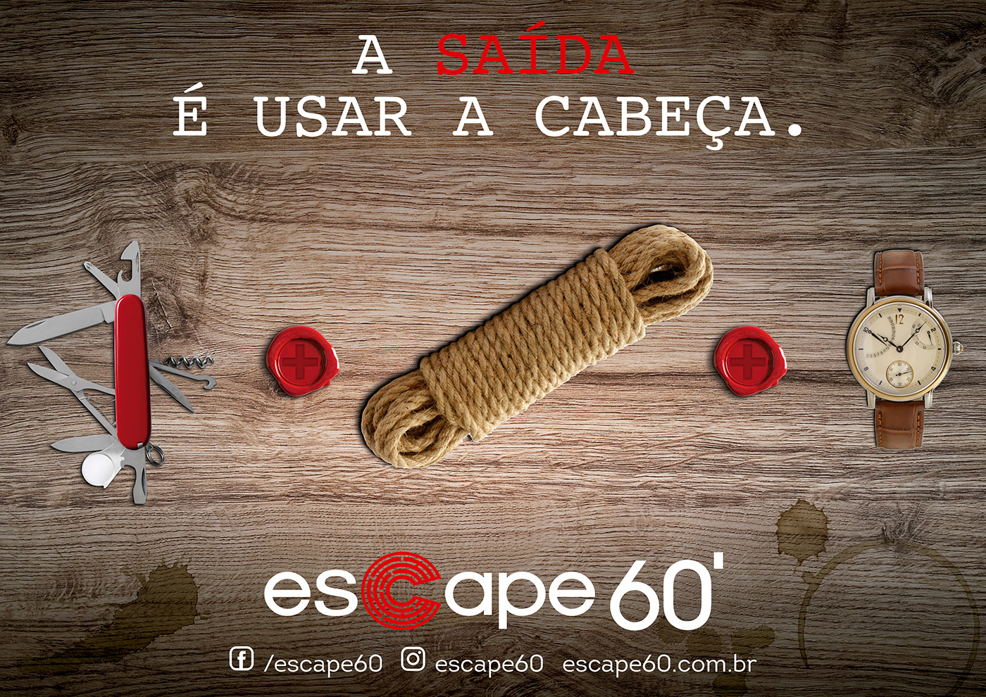 Job desenvolvido na agência Gotcha. Criação da campanha incluindo conceito visual e dos textos para o Escape 60 que é um jogo de equipe em que os participantes desvendam um enigma final através de pistas desafiadoras.
