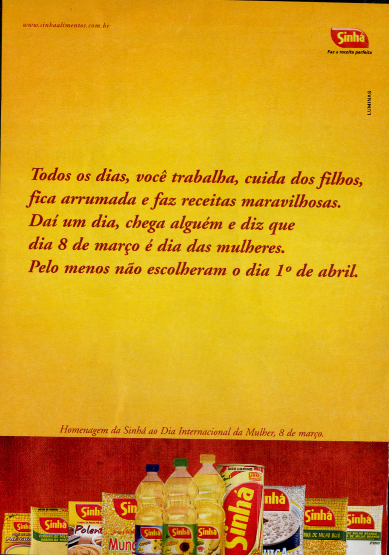 Job criado na agência Luminas para homenagear o Dia da Mulher publicado na Revista Ana Maria pela Sinhá.